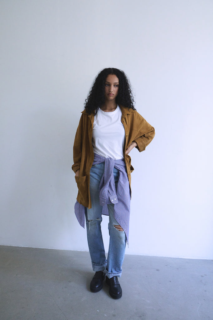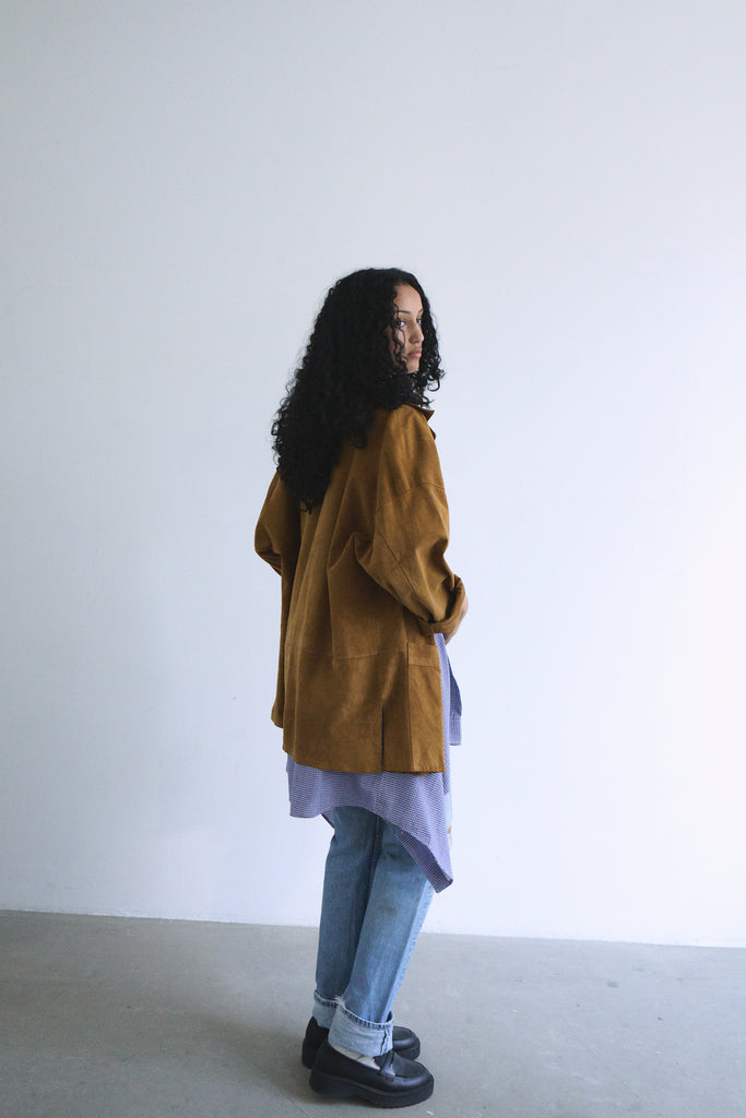 Camel Suede Jacket Blazer with a notched lapel collar and button-up front